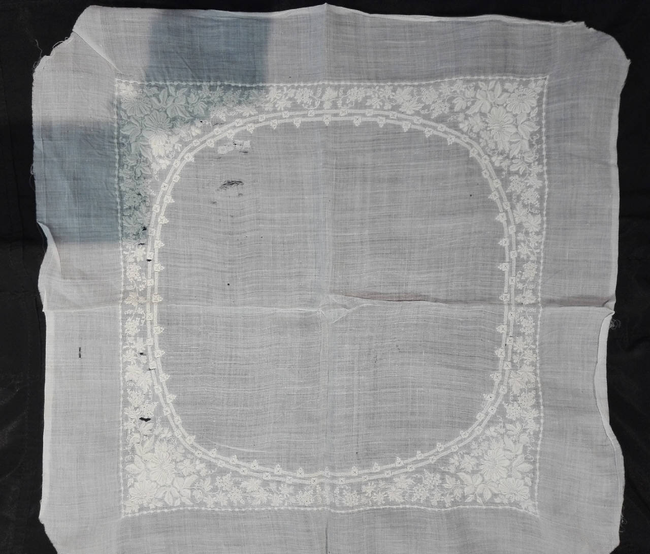 a)fazzoletto in seta di fine Ottocento - inizio Novecento appartenuto alla famiglia Vanzetti(?) con ricami floreali e cifre ES, probabilmente il bordo è stato scucito.\nb, c, d, e) fazzoletti in seta di fine Ottocento - inizio Novecento appartenuti alla famiglia Vanzetti(?) con ricami floreali a punto pieno, punto nodino, ritaglio e traforo.\nf) fazzoletto in seta con ricamo "Antonietta" appartenuto ad Antonietta Vanzetti (nata Maluta 1820 ca.) ricamato con motivi floreali e geometrici ad intaglio e sfilato con punto pieno, punto nodino, punto festone.\ng, h) fazzoletti in seta di fine Ottocento con stemma CVF (Caffarelli Vergara di Craco Francesco 1844 - 1920) ricamati con motivi floreali a punto pieno, punto nodino e punto erba.