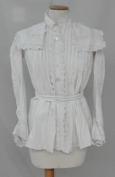 Camicia in tela di cotone con colletto montante accompagnato da collo a scialle appoggiato sulle spalle; \nchiusura frontale a sette bottoni, cinturino in vita chiuso con un bottone in madreperla.\nmaniche lunghe con polsini svasati chiusi da un bottone e asola a punto festone.\ngli orli, i colli, l'abbottonatura frontale e i polsini sono profilati da un bordo in Sangallo meccanico in cotone.