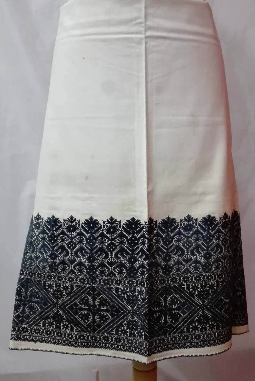 Telo in cotone bianco con bordo inferiore (25cm circa) ricamato a decoro geometrico in due tonalità di blu.\ncomposto da due pezze unite.
