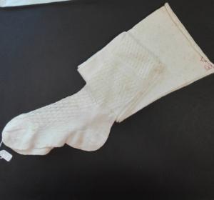 Quattro paia di calze lunghe femminili di cotone bianco, punti operati al piede e alla caviglia. \ntutte le calze sono marcate con le cifre "ME" e un cuore ricamati a punto croce rosa e rosso.\nC_2733a: fitto decoro a foglie e motivo a griglia; \nC_2733c: decoro a piccoli rombi e traforo in diagonale;\nC_2733d: decorazione a ventagli con motivi in rilievo;\nC_2733e: decorazione a righe verticali con trafori e piccole foglie.