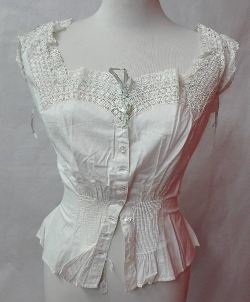 Copribusto in tela di cotone bianco con carrè decorato con quattro file di Sangallo a motivo floreale; motivo di plissettatura verticale in vita; chiusura frontale a nove bottoni; \npassanastro presente su girocollo e giromanica, nastro decorativo verde acqua.\nCifre ricamate "ER" in basso a destra.