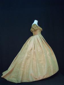 Abito da ballo femminile in taffetas di seta color caramello; piccolo corpino a vita piuttosto alta decorato da passamaneria con frange sullo scollo e sulle corte maniche; chiuso nella parte anteriore da cinque bottoni rivestiti in filo. il corpino è unito alla gonna, caratterizzata da un ampio volume nella parte posteriore che crea lo strascico, da una serie di gancetti che si uniscono ad asole in filo a punto festone. un cordoncino profila la gonna lungo l'orlo.