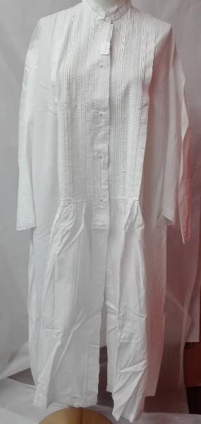 Camicia da notte da parto in tela di cotone bianca con apertura anteriore a cinque bottoni decorata da smerlature ricamate a macchina; maniche lunghe, colletto a listino.\niniziali ricamate in rosso a punto croce "RG" sul bordo inferiore.