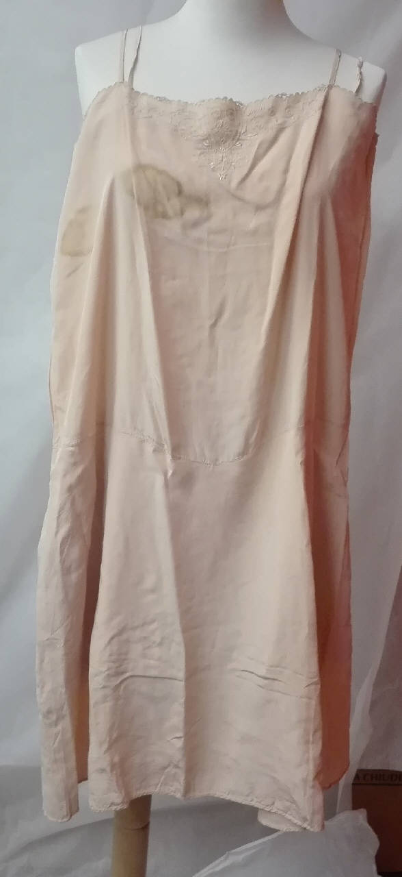 Sottoveste-combinazione di seta color pesca, spalline sottoli, ricamo nella parte anteriore; \npantaloncino interno chiuso da una serie di bottoncini laterali.