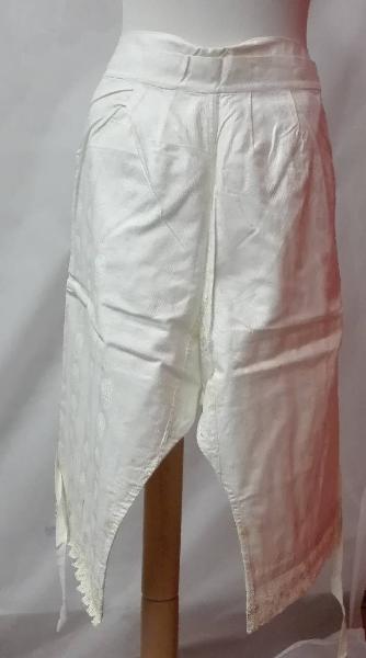 Mutande in damasco di cotone con motivi circolari positivo/negativo, chiuse in vita con lacci e bottoni; bordo a filet meccanico smerlato.