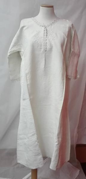 Camicia da notte in tela di lino pesante sbiancato, maniche al gomito, scollo rotondo decorato con ricamo smerlato a trifogli.\nSulla parte anteriore ricamo a motivo floreale a punto pieno, punto nodino, punto festone.\ntracce del disegno preparatorio del ricamo
