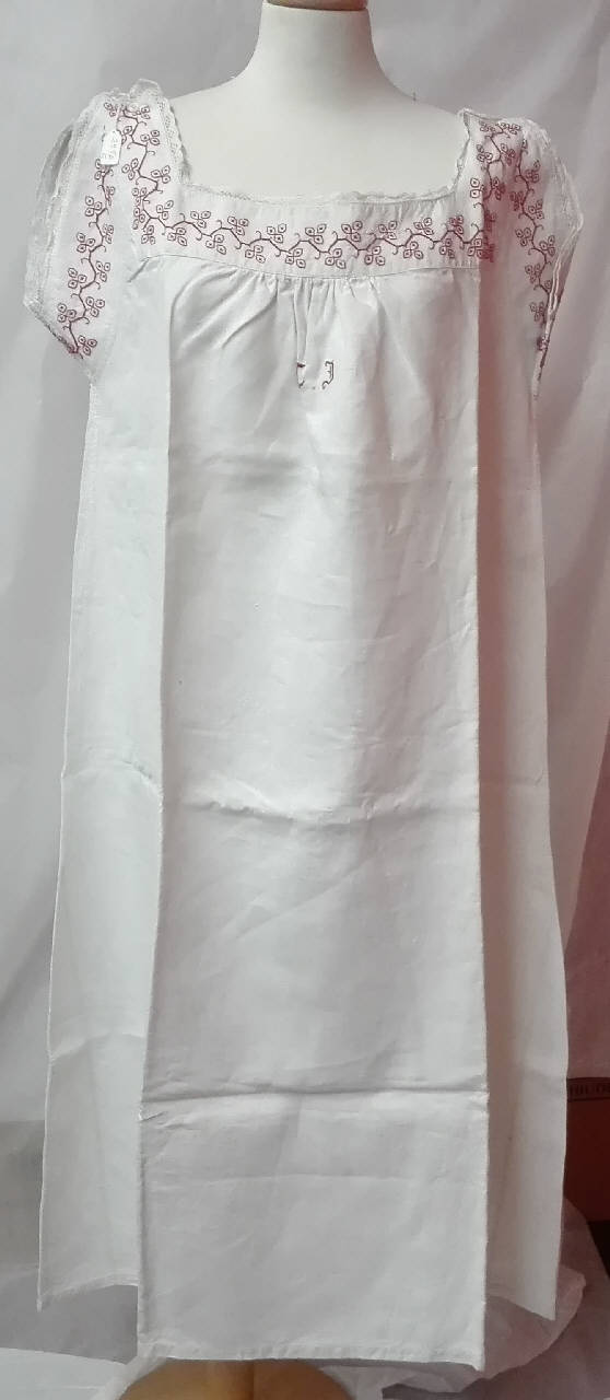 Camicia da notte a maniche corte, scollo squadrato profilato da un ricamo a punto scritto in filo rosso; monogramma "CI" ricamato al centro; due bottoncini a chiusura delle spalline.\nscollo e maniche decorate con applicazione di un bordino a fuselli meccanico.