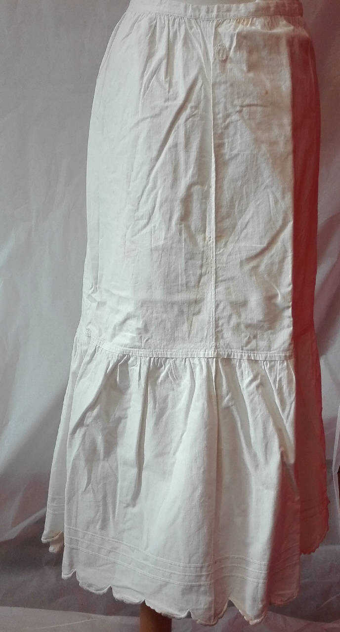 Sottogonna in tela di cotone bianco, volant nella parte inferiore rifinito da smerlature a punto festone; chiusura in vita con lacci.\npiccolo monogramma ricamato "MC" entro un ovale coronato da un giglio.