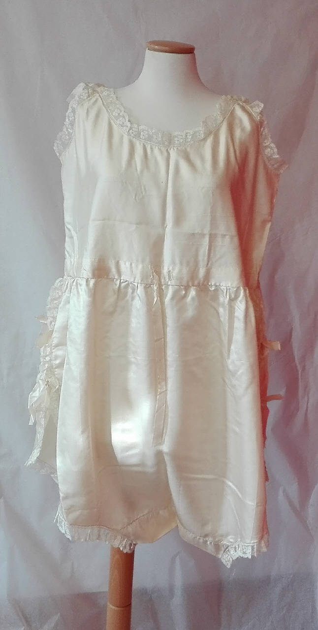Combinazione in raso di seta color avorio con spalline a nastro, stretto in vita e sui lati da un nastro (parzialmente mancante); piccolo volant in pizzo Valenciennes lungo i profili.