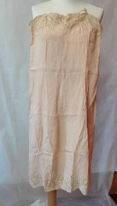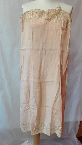 Sottoveste sostenuta da spalline in crespo di seta rosa con bordura superiore e inferiore in pizzo meccanico cipria.
