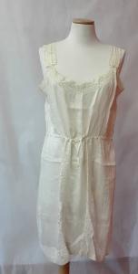 Sottoveste di seta bianca con scollo, spalline e fondo intarsiato con una falsatura in filet a motivi geometrici, in vita nastro di raso color pistacchio passante in coulisse.