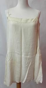 Sottoveste in taffetas di seta color avorio sostenuta da spalline, lunghezza sopra al ginocchio, arricciature ai fianchi. Allo scollo, bordo con merletto a fuselli meccanico a motivo floreale. \nNella parte anteriore ricamo con roselline a punto vapore. \nin corrispondenza del giro manica destro vi è un piccolo monogramma "LP". \nsul fondo, orlo a giorno e tre asole a punto festone posizionate nella parte centrale interna dell'orlo.