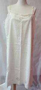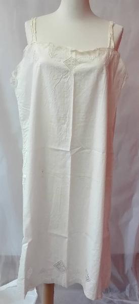 Sottoveste in tela di cotene sostenuta da spalline; scollo, spalline e orlo inferiore con intarsi in tulle a motivo di dentellature. \nNella parte anteriore sul corpino e al fondo ricamo a fili tirati e intarsi romboidali a filet.\nAsole per passanastro in vita, nastro mancante.