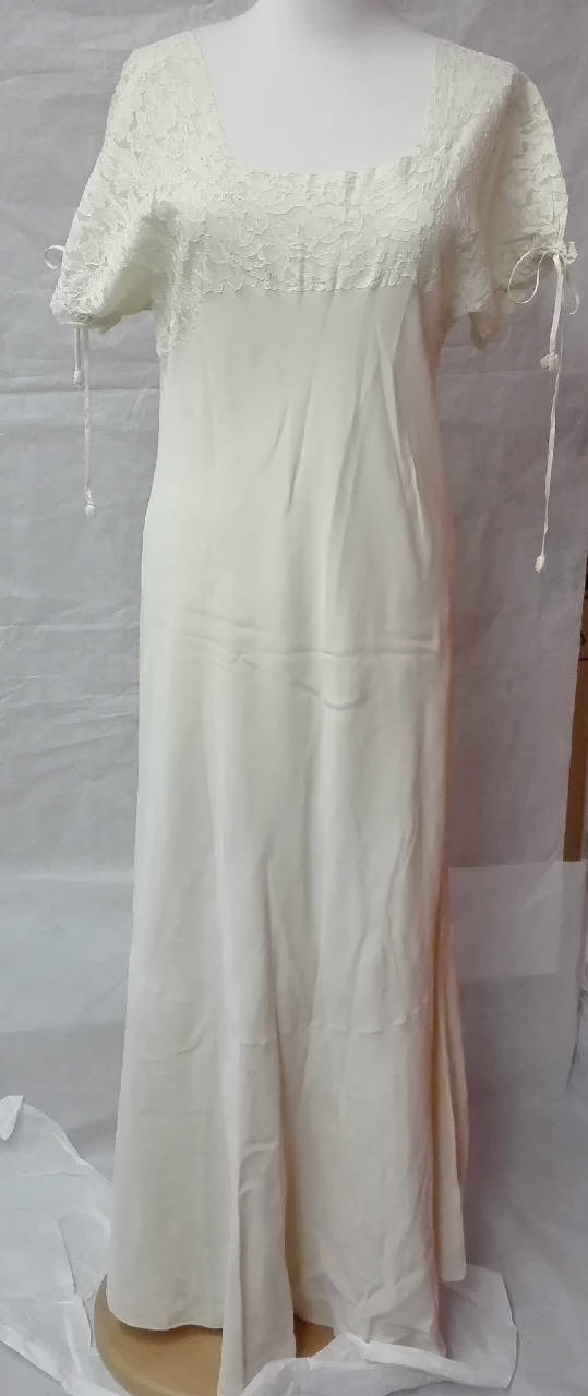 Camicia da notte (C_2353a) con bolerino coordinato (C_2353b) in crespo di seta avorio. \nIl carrè e maniche corte della camicia da notte sono create da una falsatura in merletto meccanico finemente decorata con motivi floreali; \nmaniche profilate da tulle e strette da un nastrino di seta in colore che termina con piccole nappine di tulle. \nBolerino con apertura frontale e larghe maniche al gomito aperte nel giromanica; profilature in tulle a volant e una falsatura sul lato destro con lo stesso merletto della camicia da notte.
