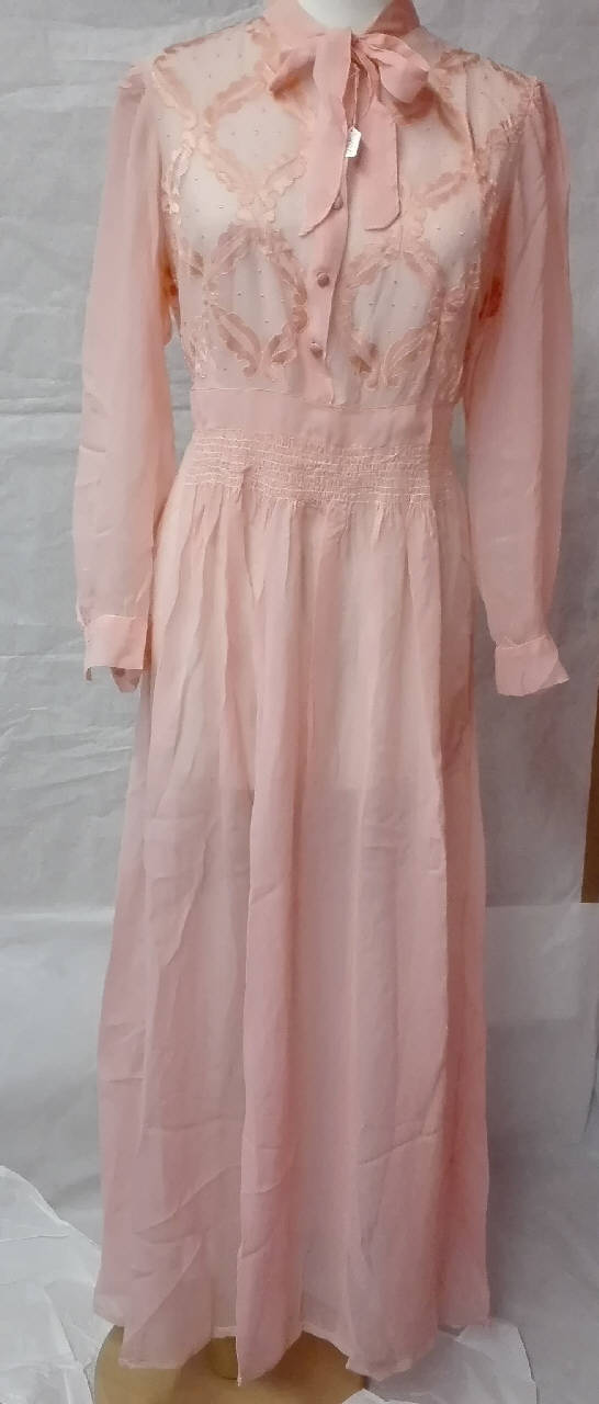 Camicia da notte in voile di seta rosa, manica lunga con polsino chiuso da bottone, colletto montante chiuso da nastro e allacciatura centrale che dal collo scende fino al punto vita con cinque bottoncini ricoperti in raso; arricciatura in vta a punto smock.\nil corpino è decorato con applicazioni in raso di seta in tinta e piccoli pois a punto pieno.\npiccola etichetta a nastro "B. Finzi & c., Milano".\nsul bordo inferiore, piccola profilatura in tulle di cotone