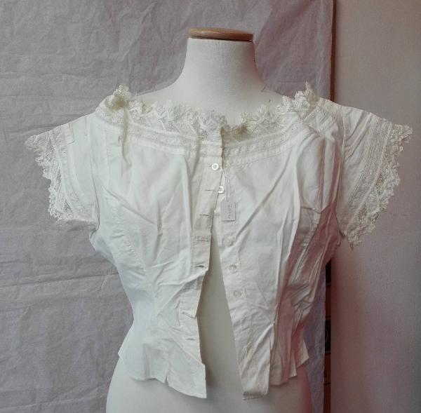 Copribusto in tela di cotone bianco con merletto a fuselli meccanico smerlato allo scollo e all'orlo delle maniche corte; \nallacciatura anteriore con otto bottoncini in madreperla.