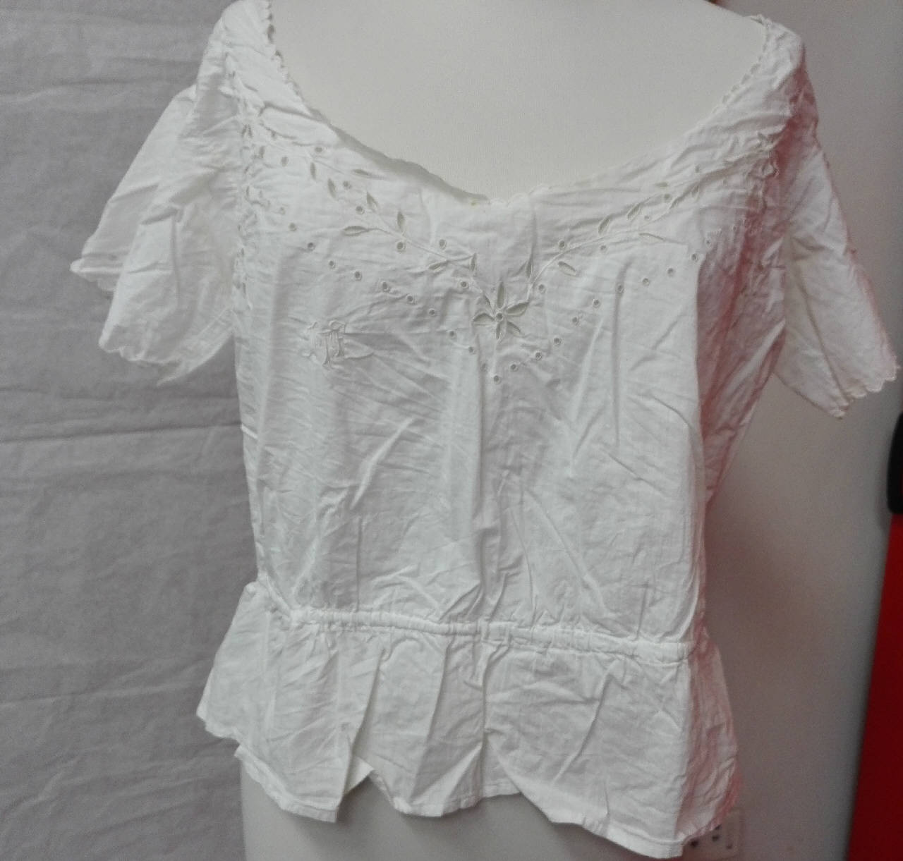 a) Copribusto in tela di cotone bianco con allacciatura posteriore a cinque bottoncini in madreperla; \ndecorazione anteriore a motivo floreale a punto intaglio, sulla destra monogramma a punto pieno "MTF"; allo scollo e alle maniche smerlatura a punto festone. \nIn vita culisse interna con nastro passante.\nb) corto copribusto in tela di cotone bianca con intarsi in broderie anglaise, chiusura posteriore a cinque bottoni di madreperla.\nc) corto copribusto in tela di cotone bianca profilato allo scollo e al giromanica da merletto a fuselli meccanico e da un ricamo a punto festone con motivo a ovali; al girospalla e nella parte anteriore piccolo motivo plissettato