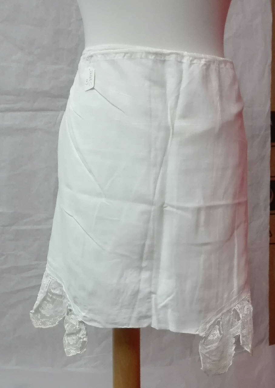 a) mutande corte in batista di cotone bianco chiuse in vita con coulisse; \nsul fondo orlo a giorno e pizzo a fuselli meccanico con passanastro (senza nastro) \nb) mutande corte in batista di cotone bianco chiuse in vita con coulisse; \nal fondo orlo a giorno e balza in garza di cotone bianca decorata con smerlature a punto festone e pois a punto pieno. \nc) lunghe mutande in cotone operato bianco a costine; chiusura in vita con lacci; completamente aperte al cavallo.\nal fondo decorazione con merletto all'uncinetto.