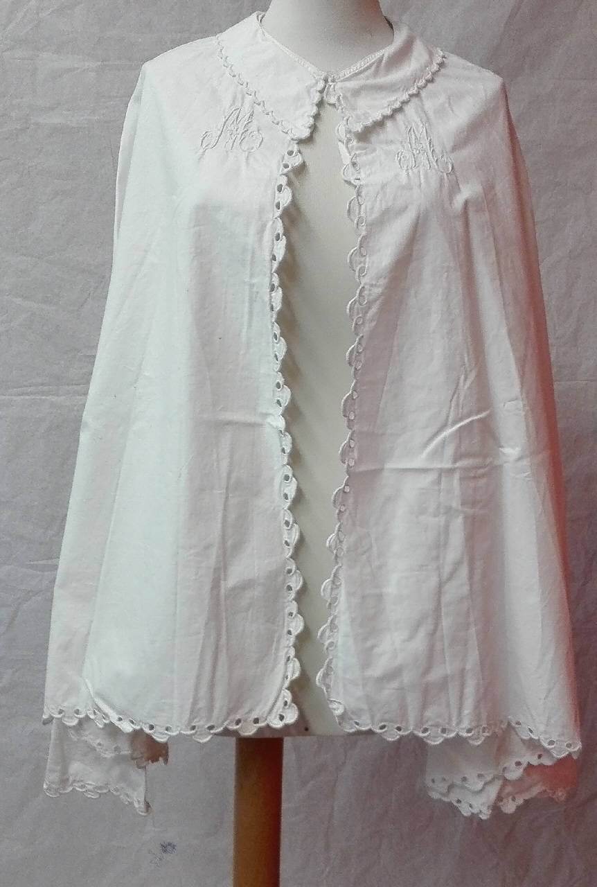 Pettineuse a mantellina in tela di cotone bianco aperta frontalmente con colletto smerlato e ricamato a punto festone; chiusura al colletto con bottone (mancante).\ngli orli dell'apertura e quello inferiore sono decorati da smerli e ricami a punto intaglio.\nsul petto ai lati dell'apertura cifre "MM" ricamate a punto pieno, punto erba e punto vapore.