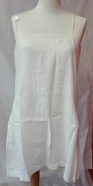 Sottabito di tela di lino bianco al ginocchio sostenuto da spalline. Allo scollo piccola smerlatura (che si ripete anche nelle spalline) e intarsio in merletto a fuselli meccanico. \nMonogramma ricamato "MRS". piccolo orlo a jour sul fondo e arricciature sui fianchi.