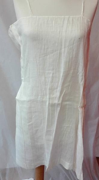 Sottoveste in batista di cotone bianco, sostenuta da spalline, lunghezza al ginocchio. \npieghe aperte sui fianchi, profilatura a giorno nelle spalline, al fondo e allo scollo dove crea un motivo smerlato. \nsulla parte superiore del corpino motivo a greca ricamato a punto ombra.