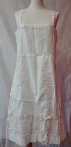 Sottoabito di tela di lino bianco al ginocchio sostenuto da spalline; le spalline e il corpino sono profilati da una smerlatura e decorati da un ricamo a motivi floreale e di festoni.\npresenza di passanastro (nastro mancante). \nmedesimo ricamo con passanastro (nastro presente) nella balza finale al fondo.