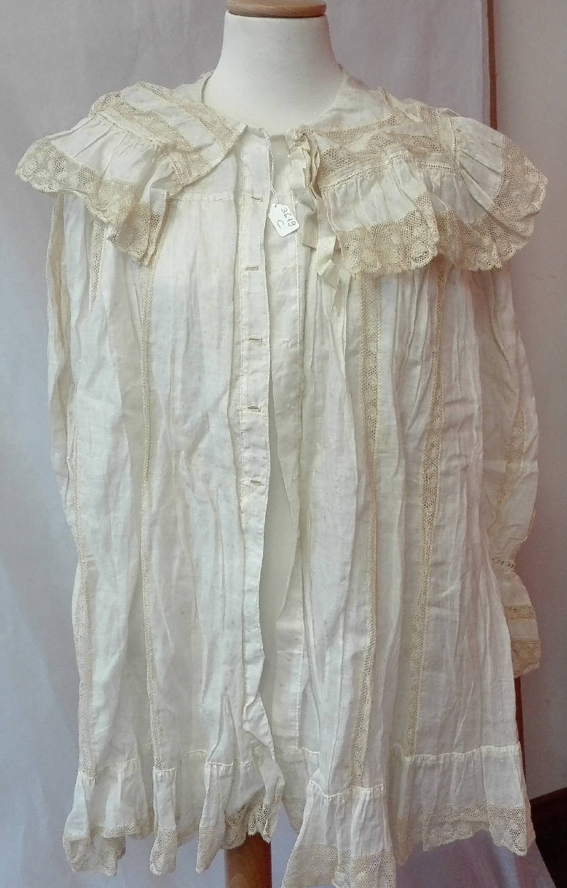 Matinèe in batista di cotone a manica lunga con chiusura anteriore a cinque bottoni (tutti mancanti); \nscollo alla marinara, profilato e intarsiato da un merletto a fuselli meccanico. \nlo stesso merletto si ritrova nel corpo del giacchino in fasce verticali e come balze a rifinire l'orlo e i polsi.\nfiocco in raso marezzato ai polsi e allo scollo.