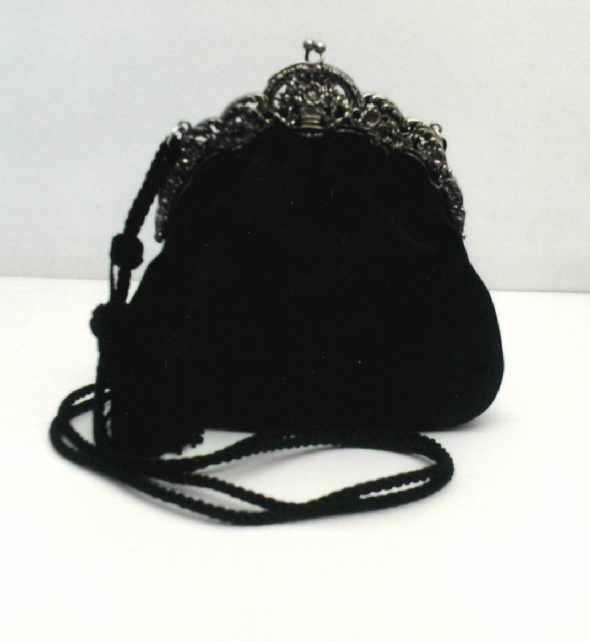 Borsetta in raso nero con ricca cerniera di anni 1920, fusione in argento