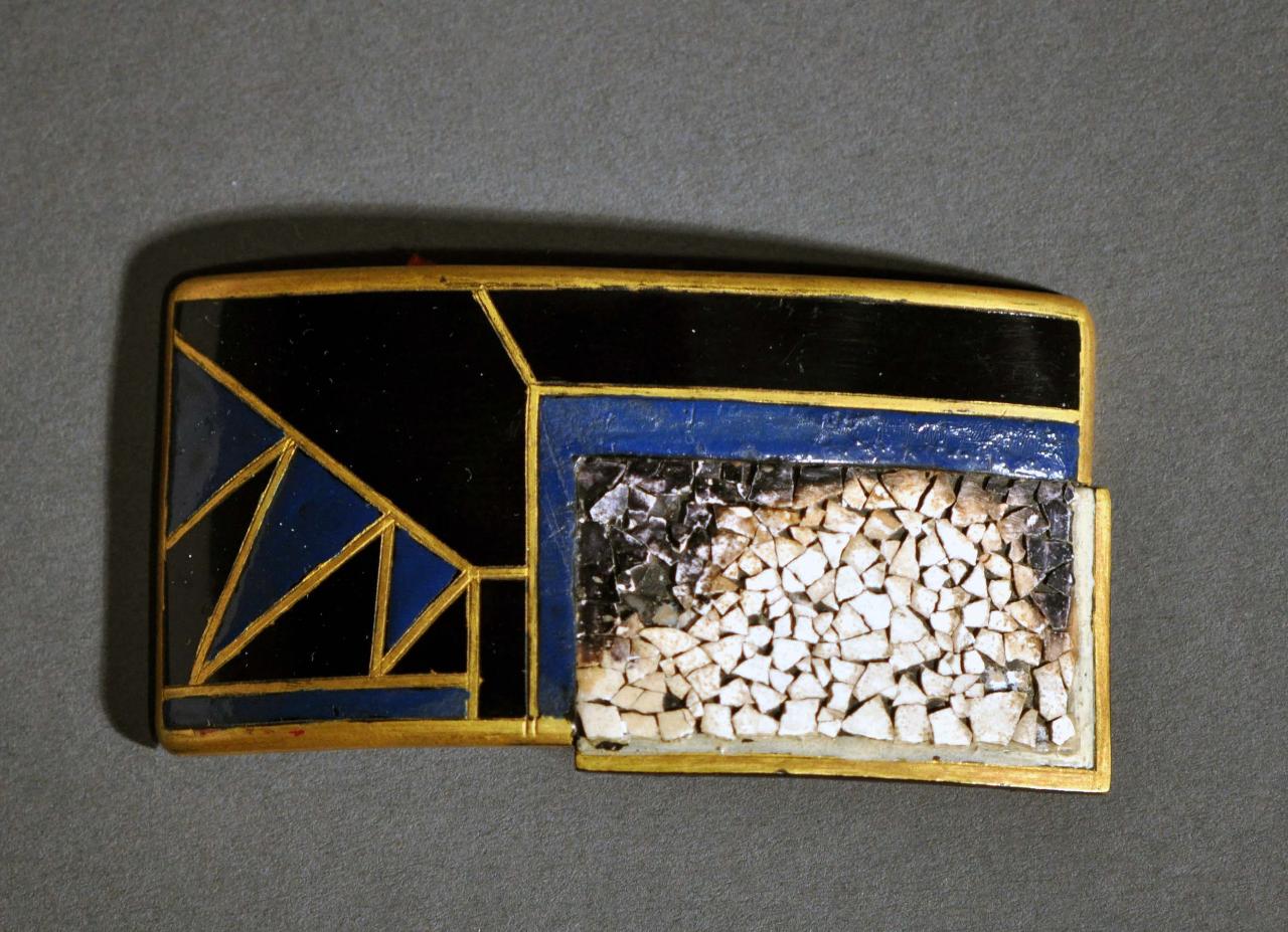 Decorazione di forma rettangolare. Corpo in galalite nera. Faccia incisa e dipinta in nero, blu e oro a motivi geometrici quadrangolari e triangolari, decorata con applicazioni in guscio d'uovo craquelé. Passanti in metallo dorato.