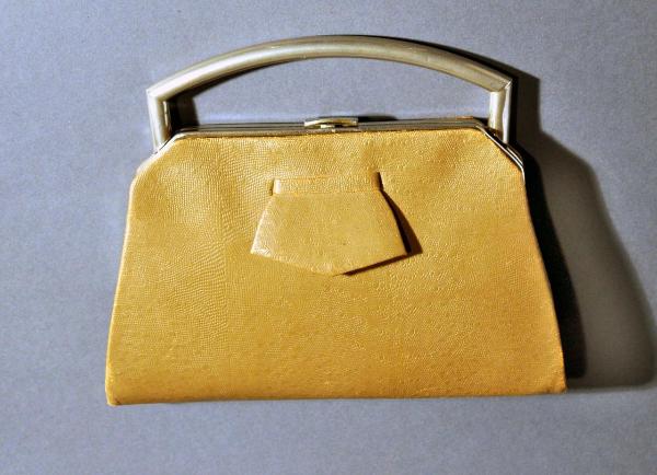 Borsa da giorno in lucertola avana; cerniera in metallo cromato; chiusura «a saltarello» in metallo; linguetta per facilitare l'apertura. Manico in metallo cromato. Interno foderato in seta avana con portamonete centrale realizzato nel medesimo tessuto, cerniera in metallo e chiusura a scatto, foderato in seta bianco avorio; taschina cucita e specchietto coordinato.