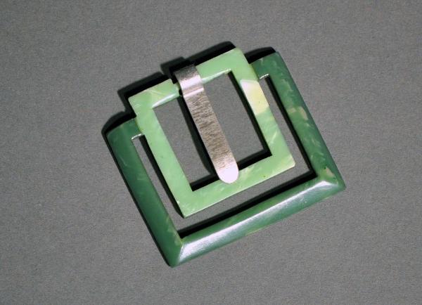 Fibbia da cintura, di forma quadrangolare. Corpo in galalite dipinta in due toni di verde. Anello decorato a traforo, formato dal raccordo di una fascia piatta quadrata verde acqua inserita in una seconda fascia piatta rettangolare verde smeraldo. Ardiglione laterale in galalite verde acqua a un rebbio in metallo.