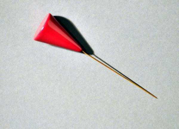 Spillone da cappello in metallo cromato e galalite bordeaux sagomata a guisa di cono capovolto.