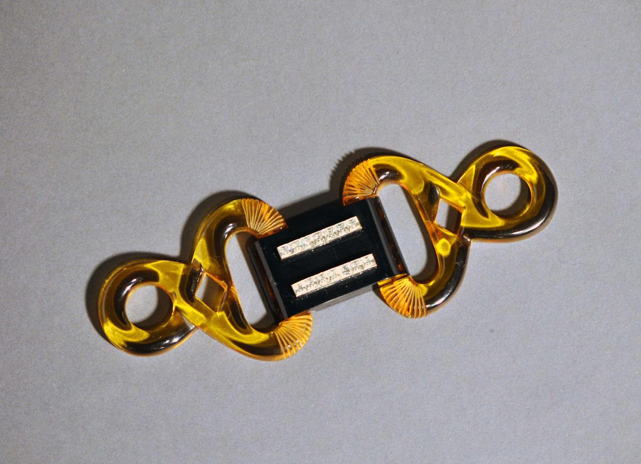 Fibbia da cintura di forma composta. Corpo in galalite trasparente gialla a imitazione dell'ambra, in due pezzi. Ciascuno inciso e lavorato a traforo a creare motivi a forma di nodo; elemento centrale di raccordo, che funge da gancio di chiusura, in galalite nera decorato con due fasce parallele operate con strass incolori taglio carré. Internamente è presente l'incisione «MADE IN/CZECHO/SLOVAKIA».