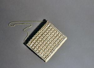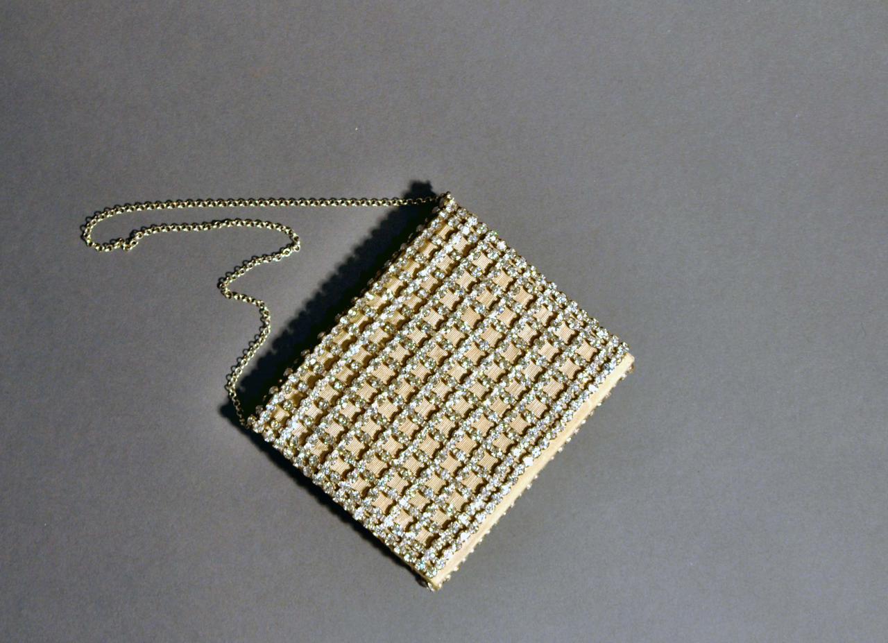 Borsa «a portafoglio» da sera in seta marezzata crema interamente ricoperta da un reticolo di strass; chiusura con bottone automatico in metallo; manico a catenella in metallo. Interno in seta marezzata crema con tre taschine laterali, un portamonete centrale chiuso con bottone automatico in metallo e un piccolo specchio bordato in pelle di capretto.