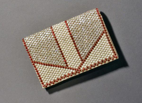 Borsa «a busta» da sera in seta marezzata crema interamente ricoperta da un reticolo di strass incolori, semisfere in bachelite avorio e strass rubino disposti a creare motivo decorativo geometrico; chiusura con bottone automatico in metallo. Interno in seta marezzata crema con piccolo specchio inserito nella fodera della patella; tasca piatta con bordo arricciato; due piccole buste estraibili coordinate.