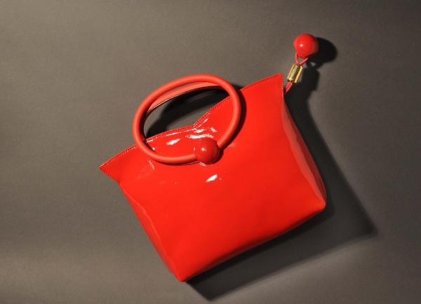 Borsa da giorno di linea sagomata a tulipano in vernice rossa; chiusura con zip in tinta, tirello in pelle satinata rossa decorato da un cilindro metallico dorato e una sfera in rodoide rosso. Doppio manico di forma ellittica in pelle satinata in tinta con attacchi in rodoide rosso. Interno foderato in tela plastificata nera stampata a motivi floreali stilizzati e scritta «MANGIAMELI MADE IN ITALY» in marrone; taschina chiusa con zip.