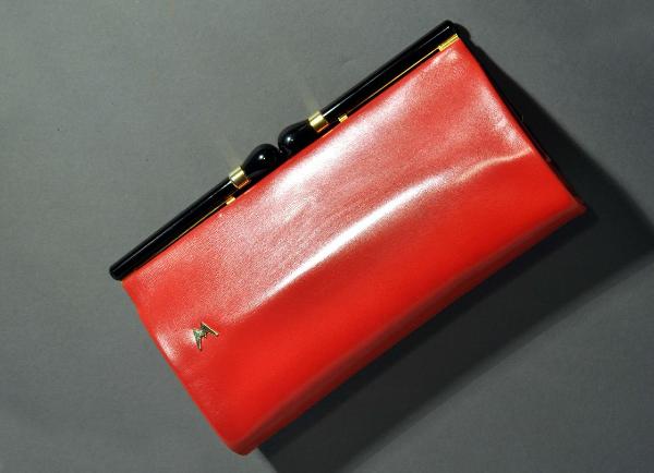 Borsa da giorno a tracolla in pelle di capretto rossa; cerniera in metallo dorato decorata con due cilindri affrontati in rodoide nera sagomati «a goccia»; chiusura a scatto in metallo dorato; logo «M» in metallo dorato applicato sul davanti. La tracolla in metallo dorato, formata da elementi a maglie rettangolari alternati a elementi quadrati con logo «M» a traforo, è fissata internamente a due asole in pelle rossa e può essere inserita nella borsa, che si trasforma così in una borsa «a mano». Interno foderato in seta rossa operata con scritte «MANGIAMELI MADE IN ITALY» e logo «MMM» alternati; tasca chiusa con zip. La borsa è corredata da una scatola di cartone marrone (33x22x6 cm) e riporta il disegno stilizzato del modello e le seguenti iscrizioni: «8010; garakid rosso; Mangiameli 842».