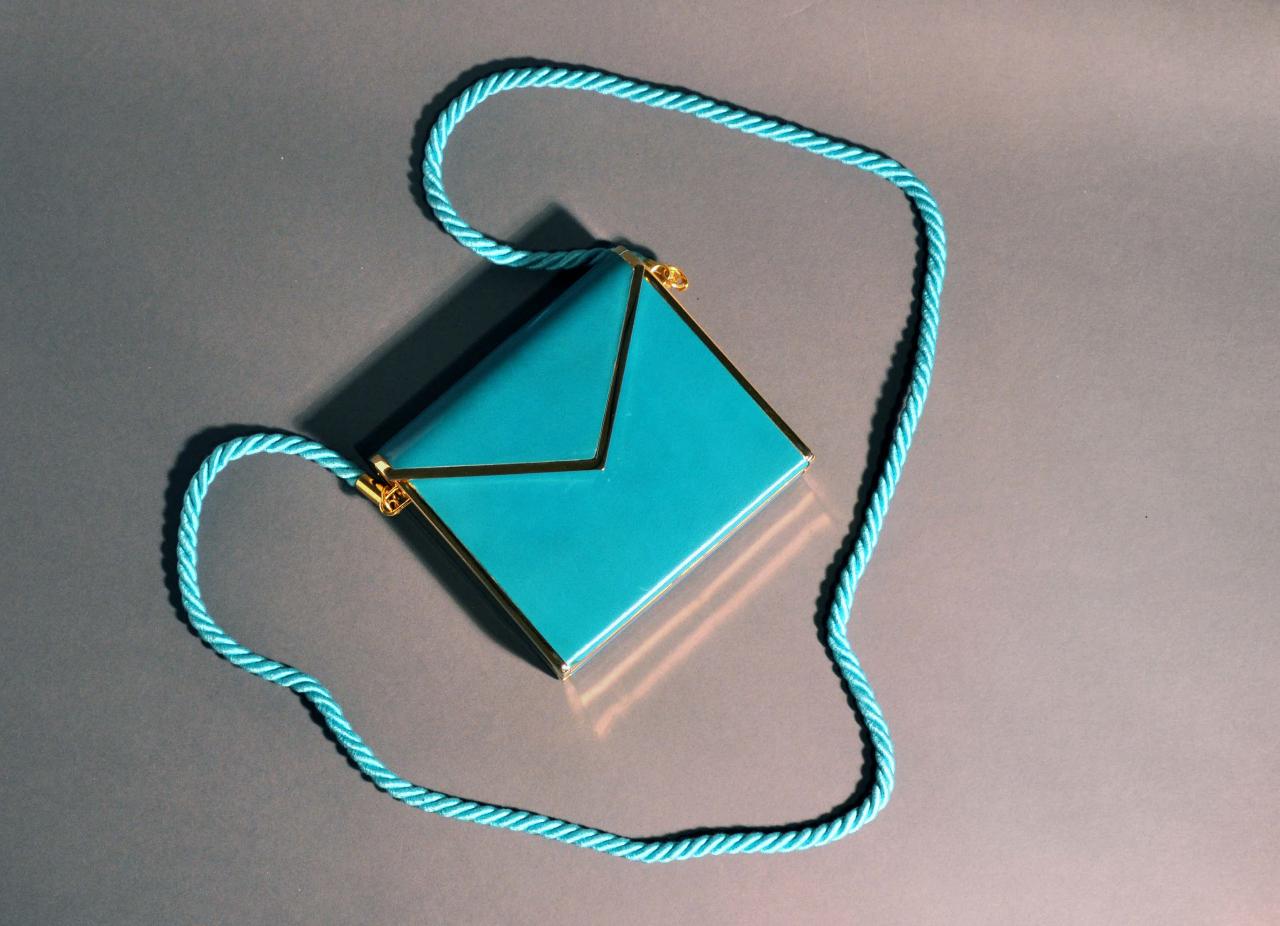 Borsa da giorno con struttura in metallo dorato rivestito in capretto turchese; chiusura con patella triangolare profilata in metallo dorato che crea, con i profili laterali della borsa, motivo decorativo a «M». Interno, foderato in seta turchese operata con scritte «MANGIAMELI MADE IN ITALY» e logo «MMM» alternati, con taschina. Tracolla estraibile in cordonetto intrecciato in seta turchese.