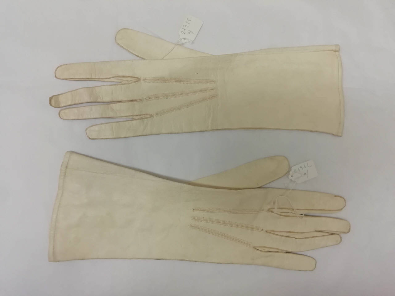 Guanti femminili in pelle di capretto bianco avorio, lunghi 30 cm. All'altezza del polso vi sono 4 bottoncini tondi mettallici neri con chiusura a pressione.