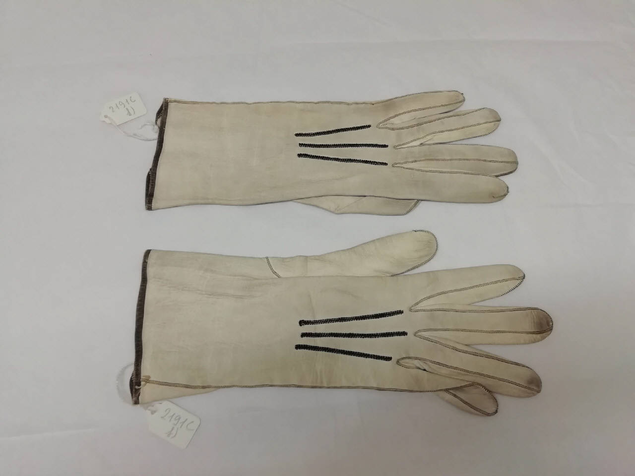 Guanti femminili in pelle di capretto scamosciata di color avorio, lunghi 28 cm. Gli orli sono in pelle di capretto marrone; sono presenti sulla parte superiore 3 cuciture a rilievo di colore nero. All'altezza del polso vi sono 3 bottoncini tondi marrone scuro con chiusura ad asola.
