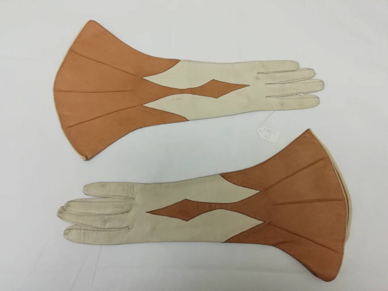 Guanti femminili in pelle di capretto lunghi 36 cm e con polsino svasato. La parte della mano è di color avorio, mentre quella del polsino è di un marrone caldo; la congiunzione tra le due parti ha una forma a zig zag. La parte superiore della mano presenta una sorta di prolungamento della pelle di colore marrone, quasi a formare una freccia. All'interno dei guanti è presente il marchio "Gants Jouvin", celebre marchio di guanti attivo dal 1834.