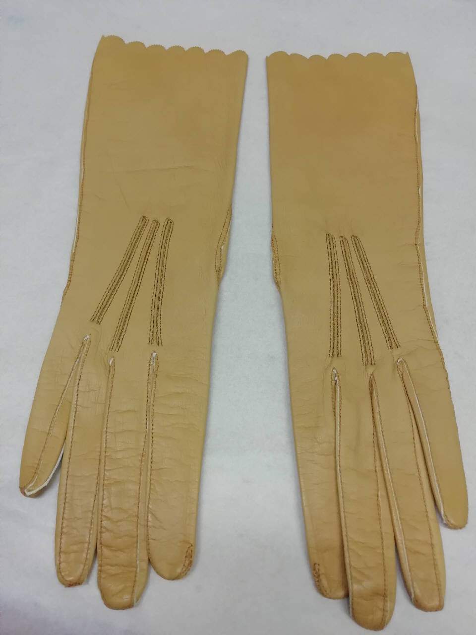 Guanti femminili in pelle di capretto color senape lunghi 30,3 cm con bordi smerlati e stondati. Marchio interno "Le Gant du Bon Marché", "Suede 1ere Marque", "6 3/4", "290".