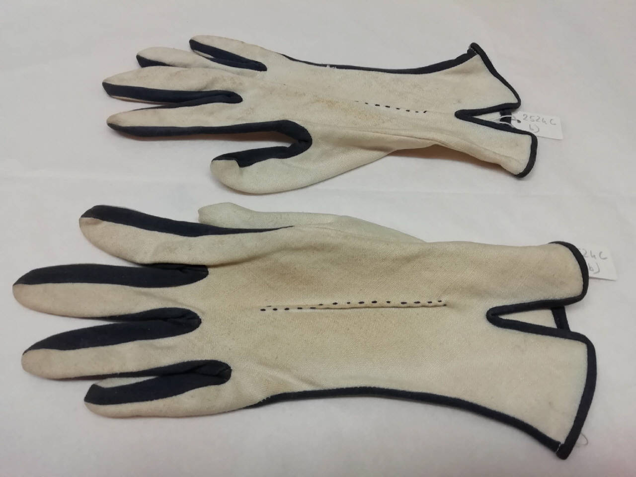 Guanti femminili in tela di lino bianca con bordi blu dello stesso materiale. Lunghezza 23,5 cm. Sul dorso presenza di cucitura verticale che vede alternarsi i due colori dei guanti. Leggero spacco sulla parte superiore.