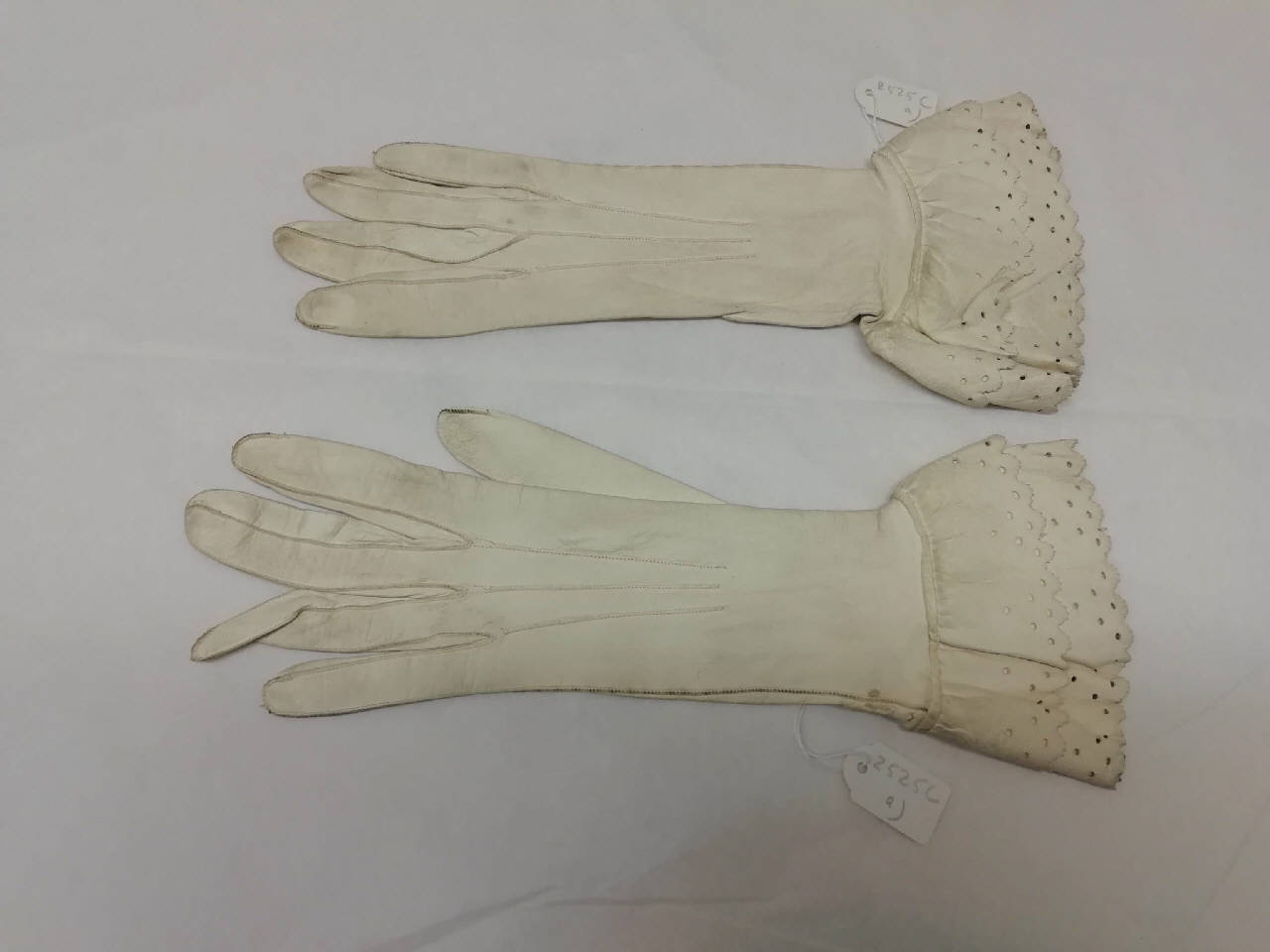 Guanti femminili in pelle di capretto color avorio lunghi 26,5 cm e 27,5 cm. Paramano con due balze traforate dello stesso materiale dei guanti. All'altezza del polso vi è un bottoncino madreperlato con chiusura ad asola; vi è inoltre un leggero spacco sulla parte esterna del paramano.