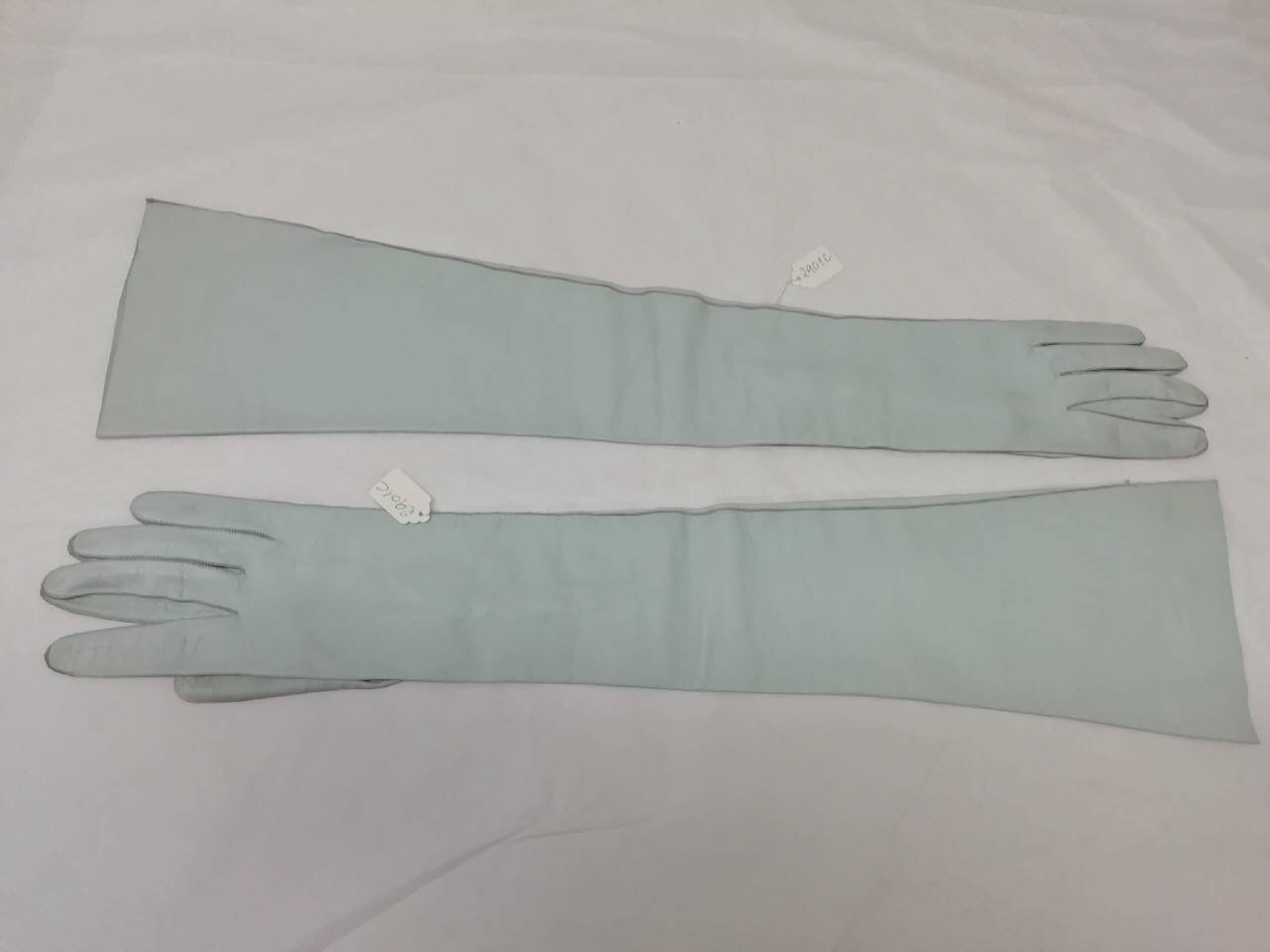Guanti femminili in pelle di capretto celeste, lunghi 45 cm. Presenza all'altezza del polso di 3 bottoncini a forma di perla di colore celeste con chiusura ad asola.