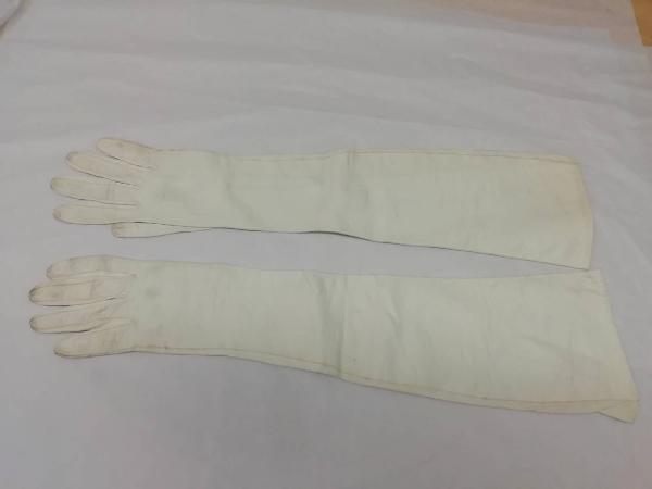 Guanti femminili in pelle di capretto color panna, lunghi 53 e 54 cm. All'altezza del polso sono presenti 3 bottoncini madreperlati con chiusura ad asola.