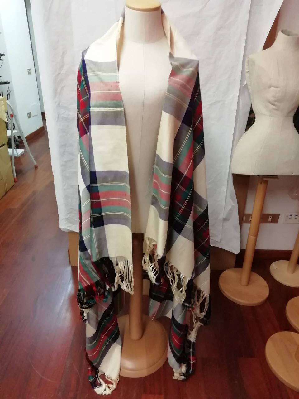 Scialle sfrangiato a quadri scozzesi in rosso, blu e verde in seta.