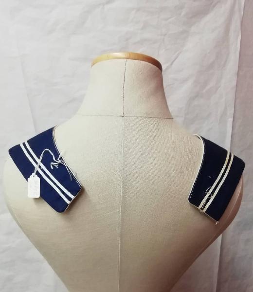Colletto alla marinara di colore blu con 2 strisce bianche decorative che corrono lungo tutto il perimetro dell'oggetto; parte interna in lino bianco.