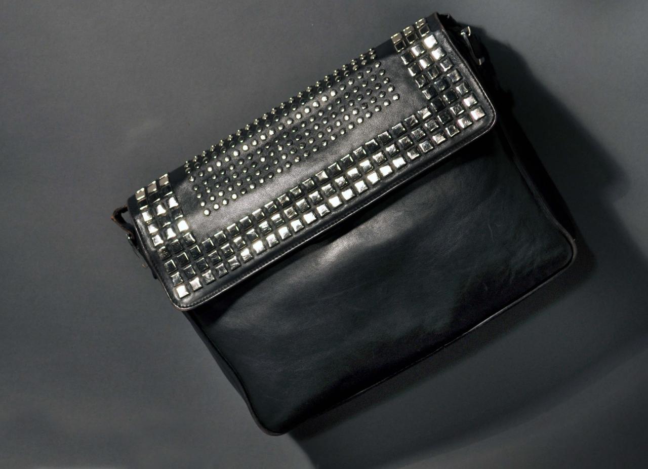 Borsa da giorno in pelle nappata nera con patella decorata con borchie metalliche argentate quadrate e circolari; chiusura centrale con zip metallica e bottone magnetico sotto la patella; tracolla in pelle regolabile attraverso due fibbie laterali in metallo argentato. Interno foderato in tessuto color nero operato con le scritte «MANGIAMELI MADE IN ITALY» e il logo «MMM» alternate; tasca chiusa con zip.
