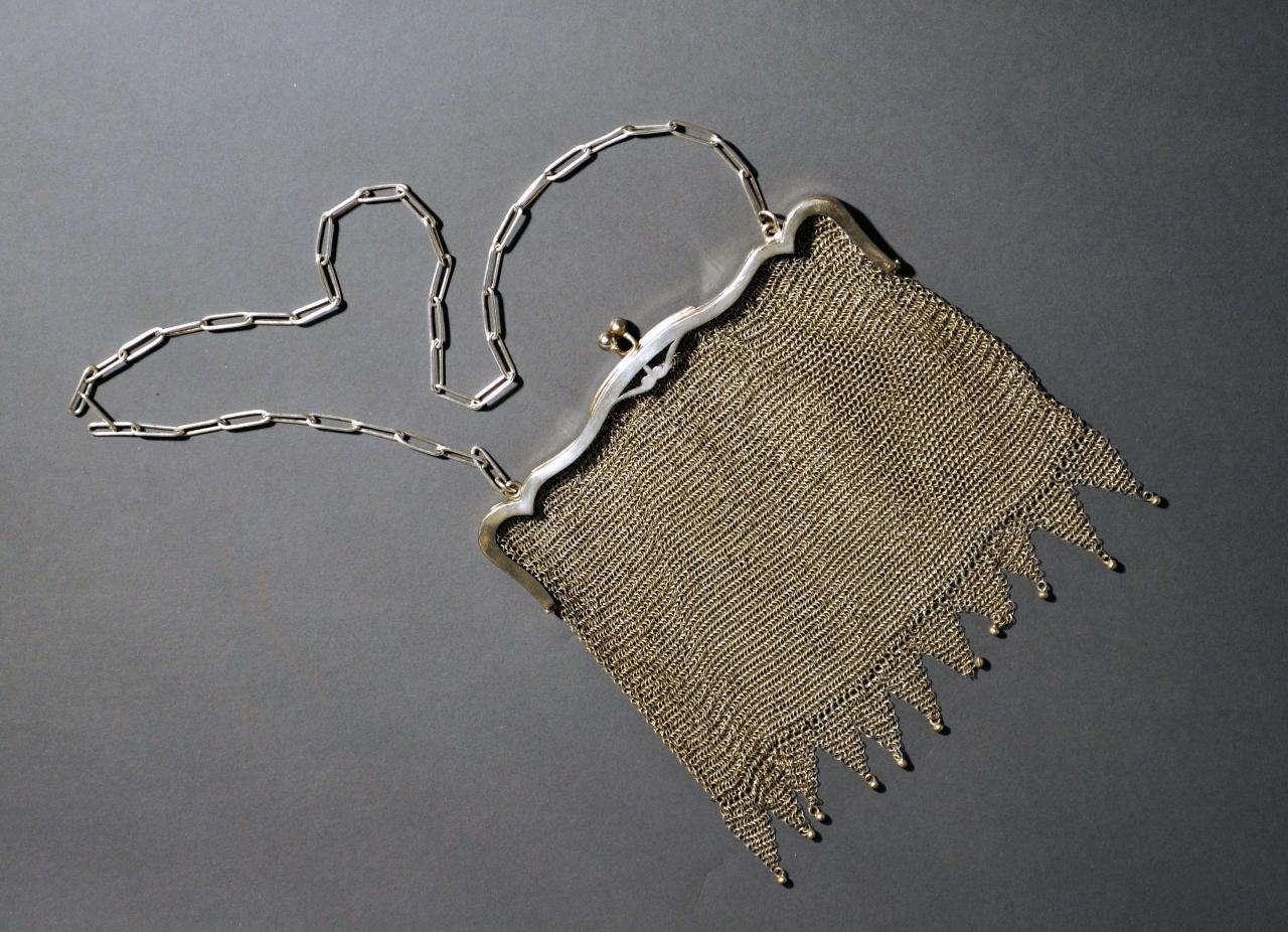Borsa da sera in maglia d'argento con bordo inferiore sagomato a losanghe decorate con piccole sfere d'argento. Cerniera in argento sagomata, chiusura a scatto. Manico a catenella in argento.